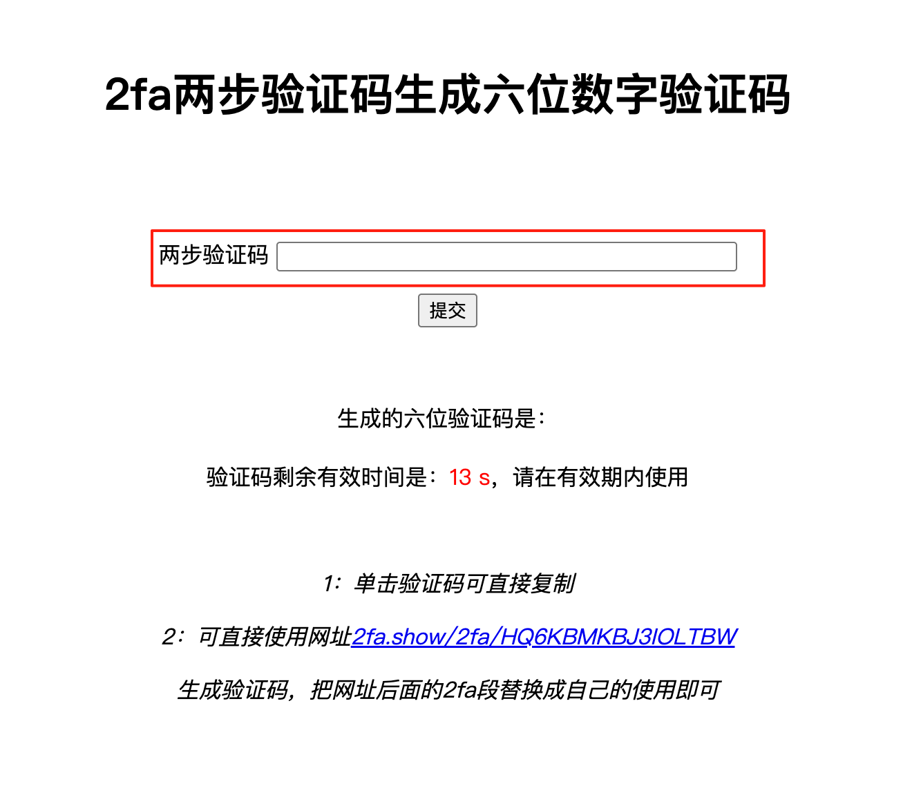 第2步:点击链接,把订单信息里面的【2FA】复制并粘贴到下面的网址里,获取验证码:https://2fa.show/,